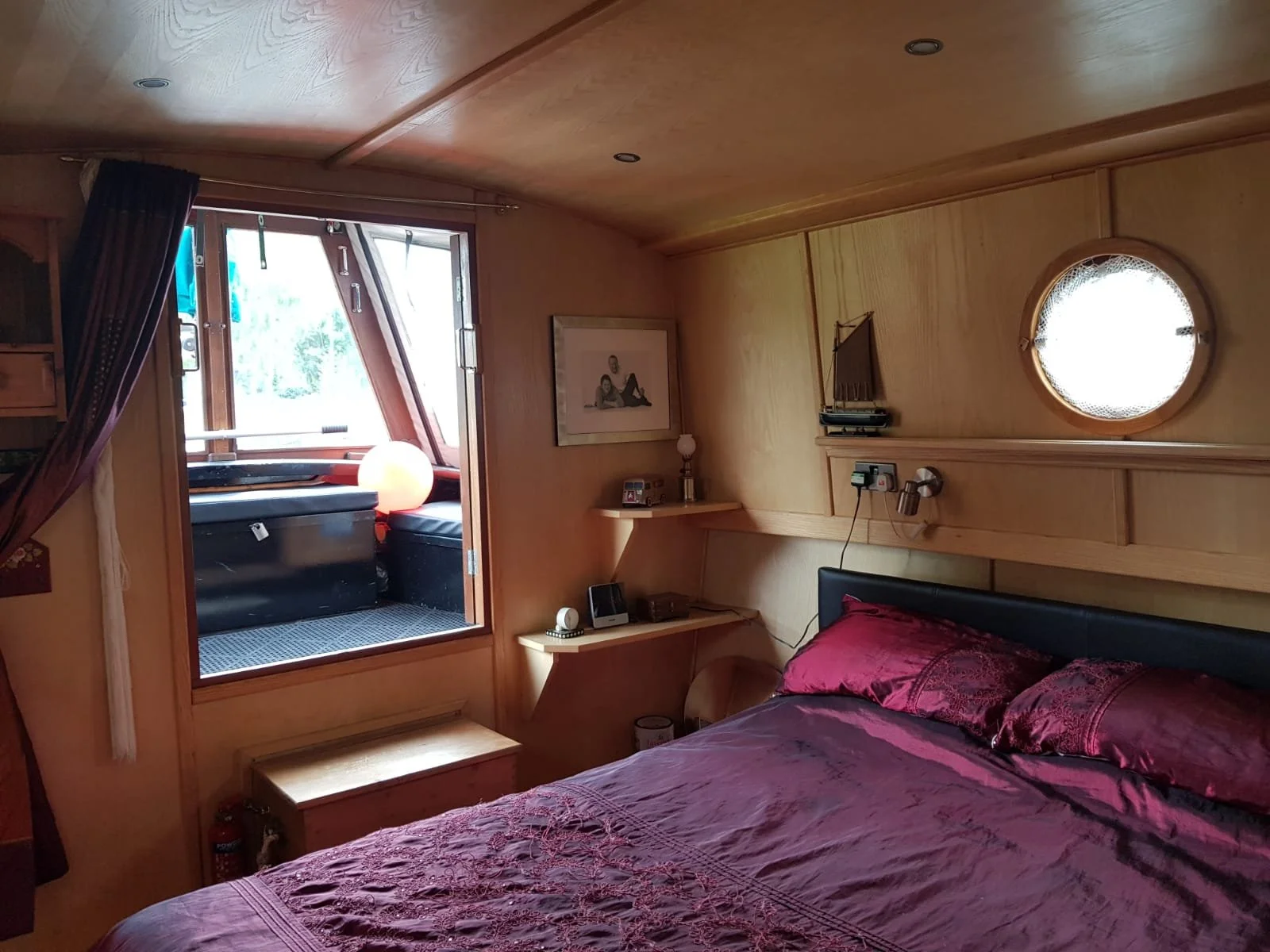 ’Merryweather’, has a reverse layout i.e living and galley areas to the stern, and a spacious covered cruiser stern. She is fully equipped for luxurious private extended cruising with a large living room featuring a comfy sofa, superb Club Chair, smart TV and a solid fuel fire for colder weather.There are fold-down lounge - and separate aft-deck - dining tables, a generous bathroom, king sized master cabin with full wardrobe space, enclosed forward deck/cockpit, and finally a large stern deck with comfortable perch seats and mood lighting to suit your occasion. The Galley is huge, with stone worktops, Belfast sink, fridge & freezer, and all other mod cons.